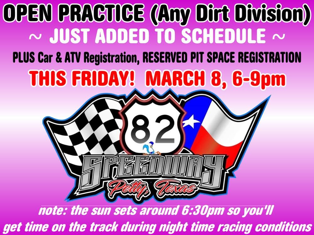 OPEN PRACTICE at 82 Speedway has just been ADDED to the schedule for THIS FRIDAY, MARCH 8th, 6pm-9pm!