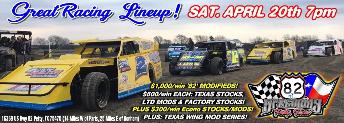 SATURDAY APRIL 20th at 82 SPEEDWAY - 7pm Races - DETAILS HERE: