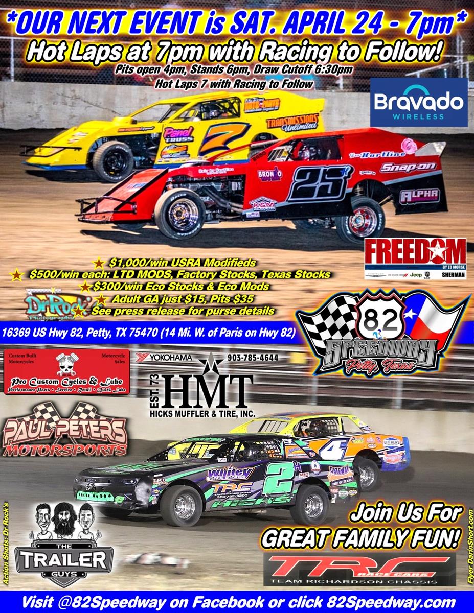 COME JOIN US for an economical night of family fun at 82 Speedway SATURDAY APRIL 24th at 7pm located exactly 1 mile east of the Petty Texas exit on Hwy 82 (south side of road)!
