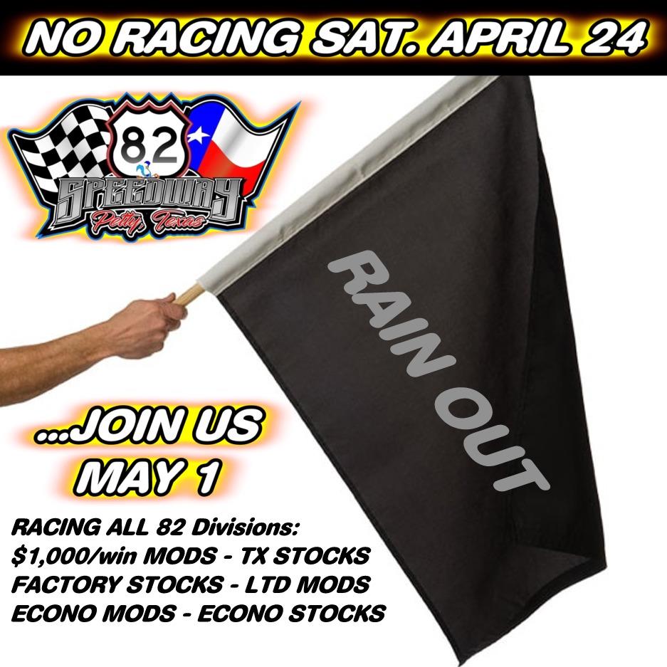 SAT. APR. 24 is RAINED OUT - NEXT RACES SAT. MAY 1!