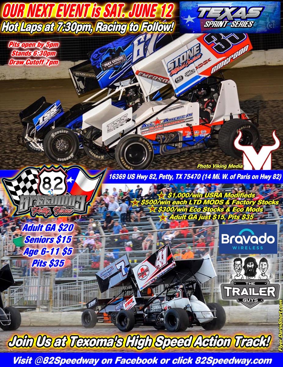 Our next event at 82 Speedway will be SATURDAY JUNE 12th with hot laps at 7:30pm, featuring the Texas Sprint Car Racing plus all of our '82 racing divisions (except Texas Stocks)! Track is located 15 minutes WEST of Paris directly on HWY 82 (exactly 1 mile EAST of Petty Texas, entrance at the BIG SHOP building located on south side of Hwy 82).