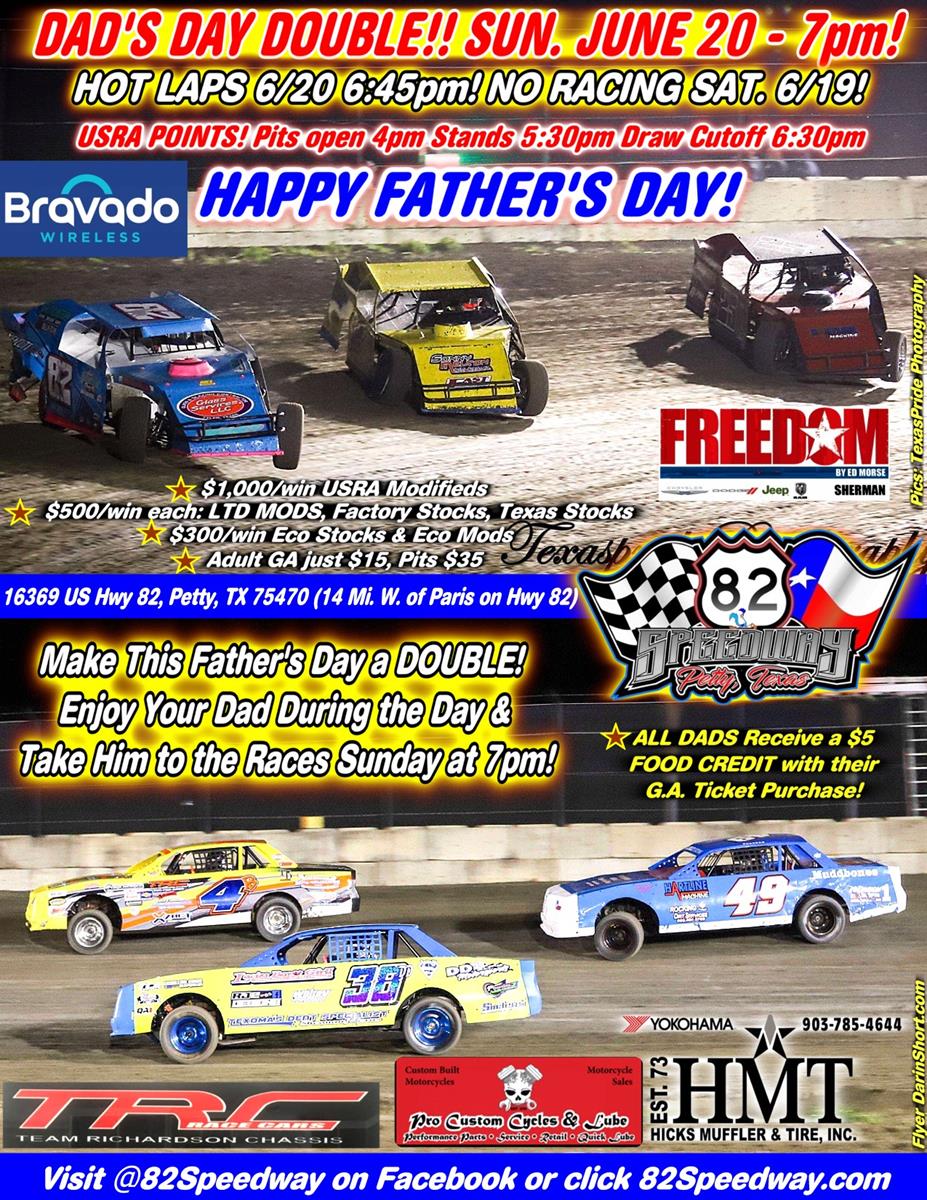 DAD'S DAY DOUBLE THIS SUNDAY JUNE 20 at 82 Speedway, 7pm! NO RACING 6/19! ALL DADS Receive a $5 FOOD CREDIT with their G.A. Ticket!