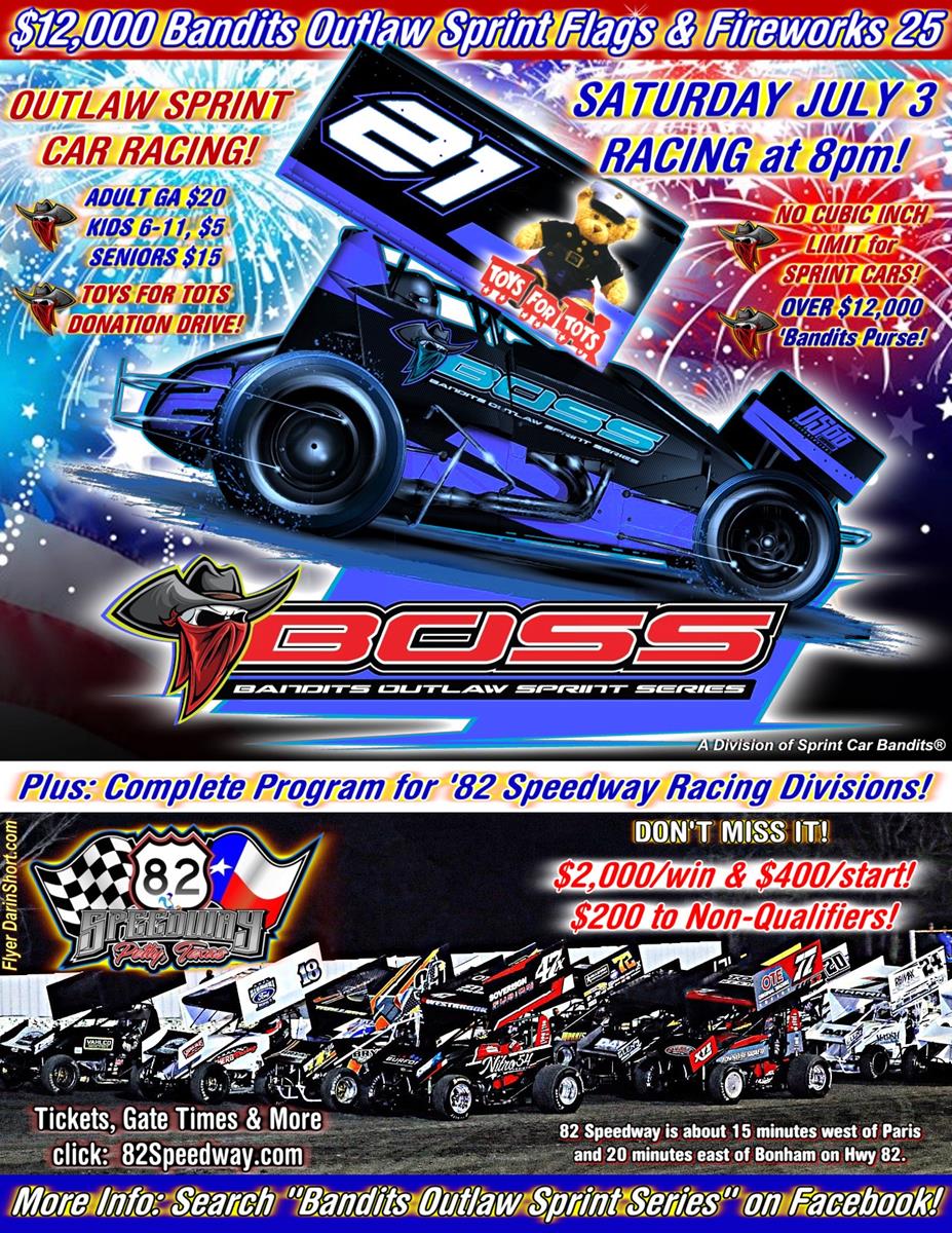 SPEND PART of 4th of JULY weekend celebrating with us! SATURDAY JULY 3rd at 8PM when the Bandits Outlaw Sprint Series will electrify the 82 Speedway crowd with high-powered winged outlaw sprint cars battling on the high banked .26 mile oval in the running of the Flags & Fireworks 25!