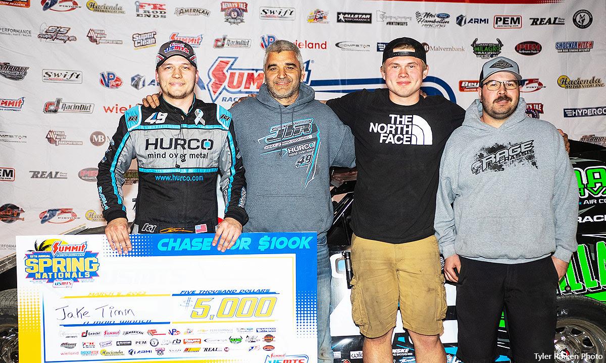 Summit Racing Equipment A Feature 1 (50 Laps): 1. 49-Jake Timm[1]; 2. 4W-Tyler Wolff[2]; 3. 4R-Dereck Ramirez[3]; 4. K9-Will Krup[5]; 5. 60-Dan Ebert[6]; 6. 10B-Brandon Givens[10]; 7. 12-Jason Hughes[18]; 8. 16-Chris Henigan[4]; 9. 24C-Jim Chisholm[12]; 10. 97-Cade Dillard[19]; 11. 10-Cayden Carter[13]; 12. 65-Tyler Davis[24]; 13. 99L-Steve Lavasseur[8]; 14. 87-Darron Fuqua[15]; 15. 4RJ-Jared Russell[7]; 16. 25C-Cody Thompson[20]; 17. 02-Tanner Mullens[27]; 18. 11X-Tom Berry Jr[25]; 19. 28-Cory Davis[9]; 20. 4D-Bo Day[22]; 21. 0-Jake O'Neil[21]; 22. 75-Terry Phillips[26]; 23. 20-Rodney Sanders[16]; 24. 38DT-Dylan Thornton[29]; 25. 65X-Carlos Ahumada Jr[14]; 26. 33Z-Zack VanderBeek[28]; 27. 21-Jacob Bleess[11]; 28. 47-Jack Sartain[23]; 29. 4-Jeremy Nelson[17]