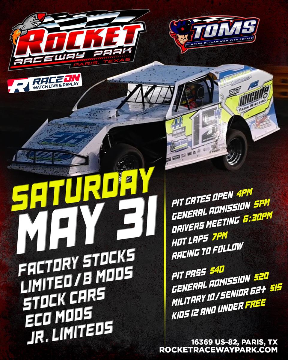 PARIS, TEXAS — Get ready for a night of high-octane action as the Touring Outlaw Modified Series (TOMS) rolls into Rocket Raceway Park this Saturday, May 31st! Fans across the region are gearing up for a thrilling showdown as some of the best Modified drivers in the South converge on the 1/4-mile dirt track for a full night of fender-to-fender racing.